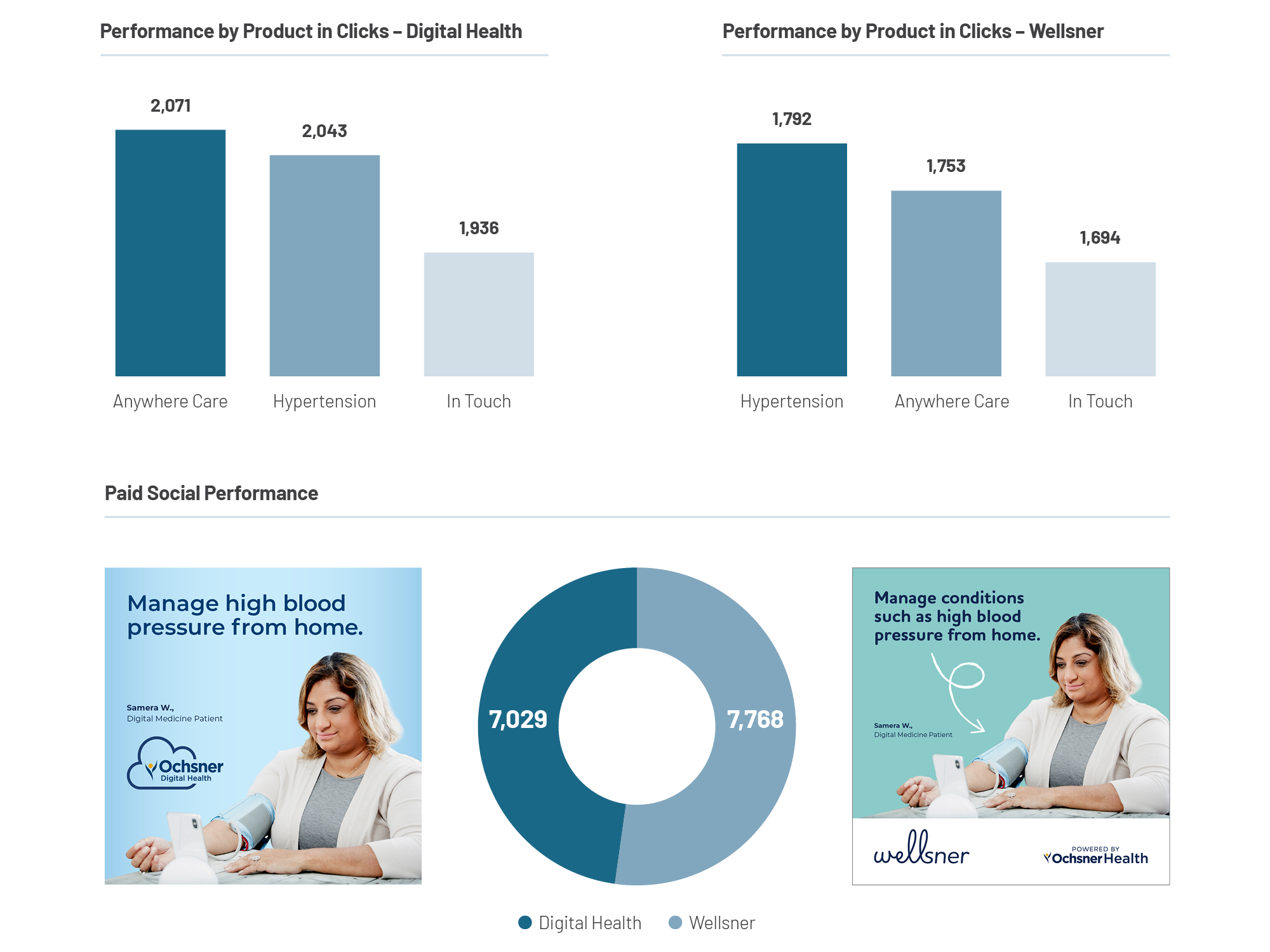 With a concurrent timeline of eight weeks and equal spend, Ochsner Health wanted to gauge both performance by product in clicks and paid social performance.